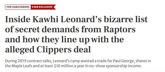 阿瑟在报道中写道:“就在那时,猛龙队才意识到,莱昂纳德并非希望被引荐给多伦多利润丰厚的企业圈——对方实际是在要求安排‘挂名岗位’,以及促成‘无需投入的投资’。最终猛龙队拒绝了这两项提议。”