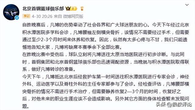 北京男篮官方社交媒体透露,经过北京积水潭医院多学科会诊,凡博腰椎左侧横突骨折,该情况不需要经过手术,但需要通过至少2-3个月时间来休养和恢复。