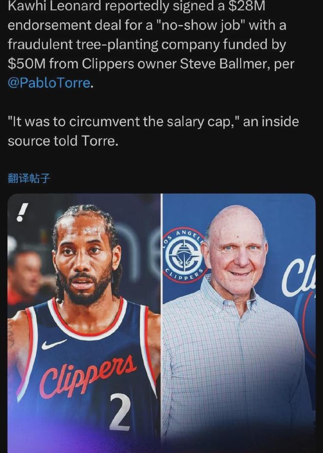Pablo Torre越查越深,他发现伦纳德跟这家植树公司签了4年2800万美元的代言合同,却什么都没有做,只是在公司里挂个名,而这家植树公司随即得到了鲍尔默提供的5000万美元资金供应。