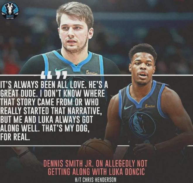 史密斯曾在2019年这么谈起东契奇:“我们之间一直充满着爱,人们试图创造出这种画面(两人关系紧张)。他是一个非常棒的家伙,我不知道这个故事从何而来,也不知道是谁编造了这个故事。但我和东契奇一直相处地很棒,他是我的兄弟。”