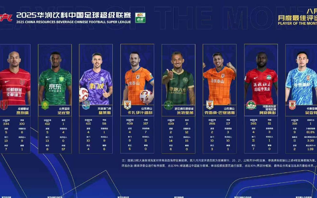 中超8月最佳球员候选:法比奥、克雷桑领衔,吴亚轲本土独苗