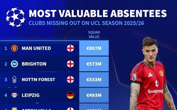 缺席欧冠球队身价榜:曼联8.87亿欧居首,布莱顿次席&米兰第六