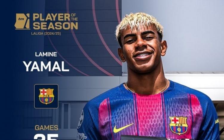 35场9球15助攻!德转官方:18岁巴萨边锋亚马尔获评上赛季西甲MVP