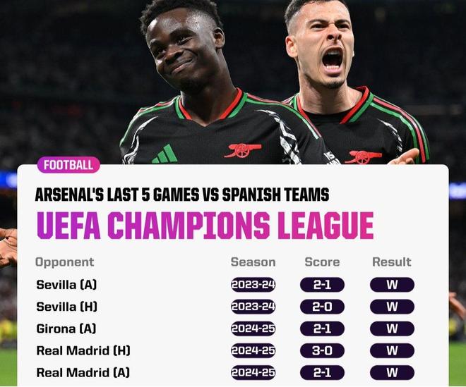 值得一提的是,枪手若今晚客场击败毕巴,他们将成为首支欧战历史第一支连续6场战胜西班牙球队的球队。
