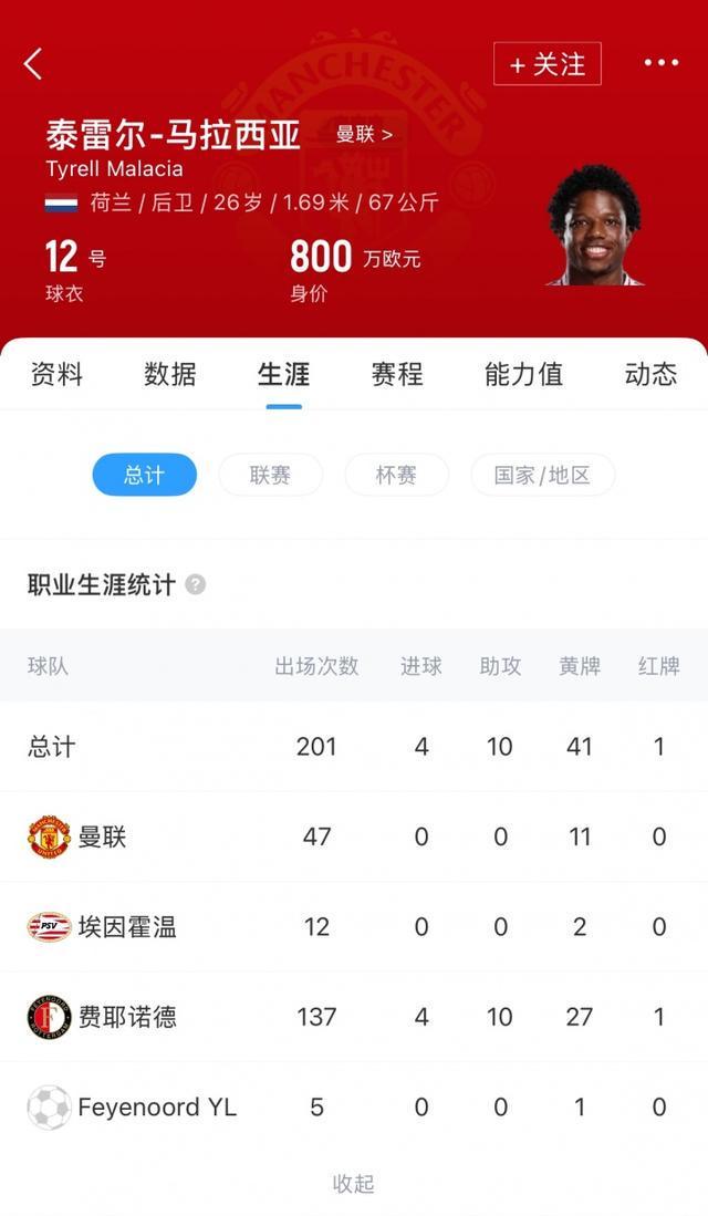 马拉西亚2022年加盟曼联,目前效力曼联3年共出场47次,0球0助拿到11张黄牌。