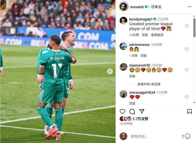 萨拉赫没有为照片进行任何配文,但不到半小时已获得5.7万次点赞,有球迷也在评论区盛赞他为英超历史最佳。