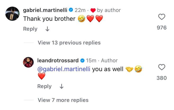 赛后,马丁内利在特罗萨德所发的庆祝贴中评论:“谢谢你,兄弟❤️❤️。”后者随即回复道:“你也是❤️。”