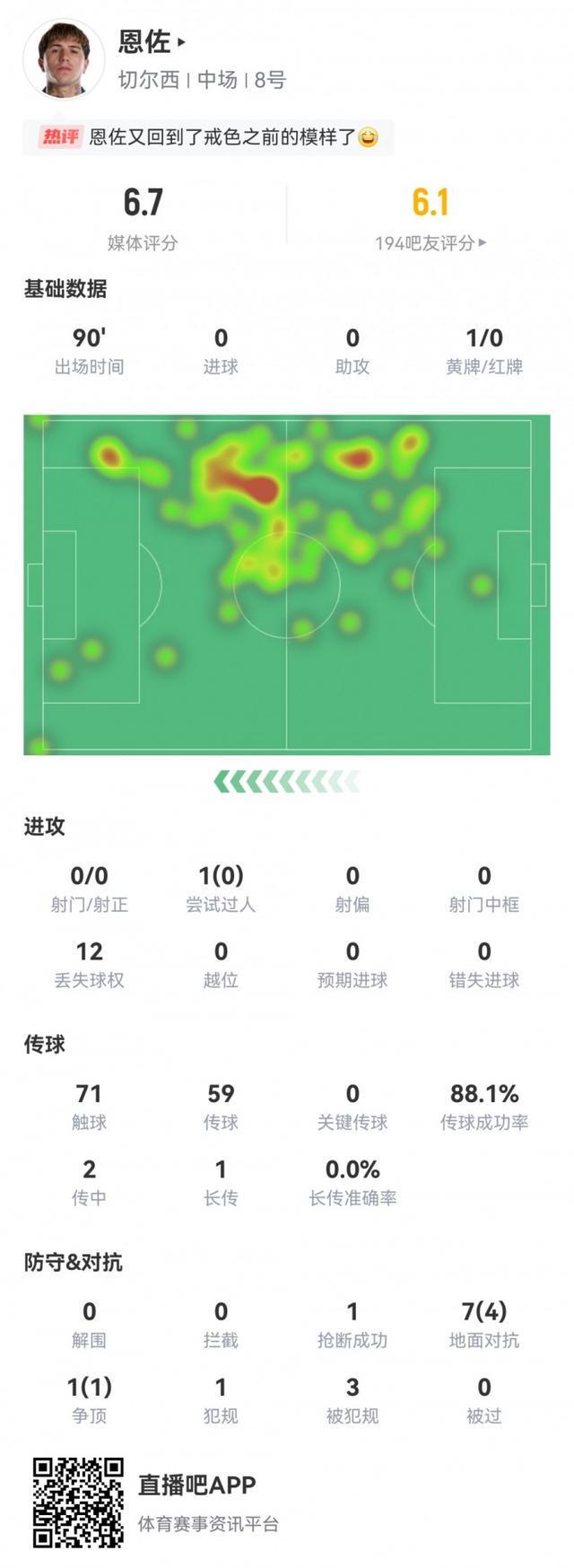 9月21日讯 本轮英超曼联2-1切尔西。此役恩佐首发打满全场,球员全场重点数据如下↓