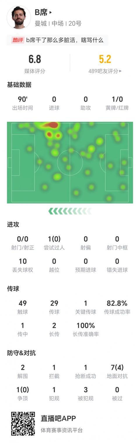 赛后技术统计数据显示,贝尔纳多-席尔瓦全场无射门,1次过人未成功,10次丢失球权,1次关键传球。在防守方面,他有着两次解围、1次拦截、1次抢断,7次地面对抗成功4次。