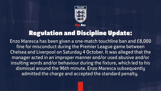 英足总官方如今表示,马雷斯卡在比赛当中存在不当行为或使用侮辱性语言,也因此导致他在第96分钟被罚出场。马雷斯卡本人已承认自己的行为,并接受处罚。