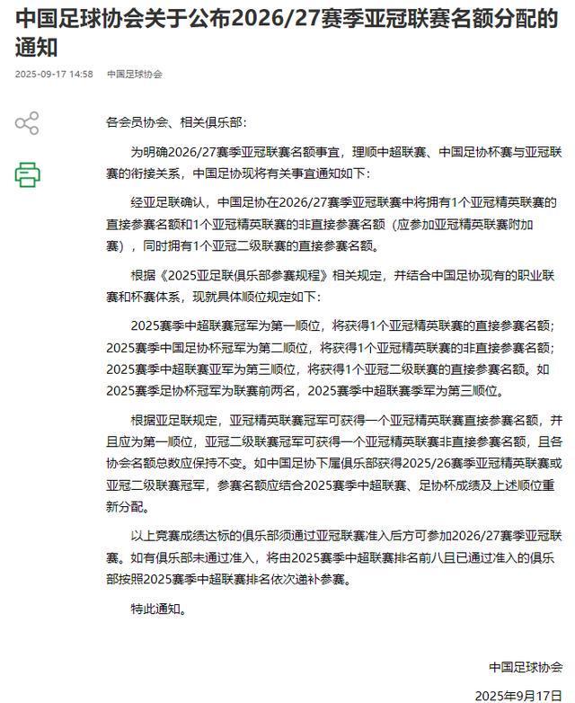 经亚足联确认,中国足协在2026/27赛季亚冠联赛中将拥有1个亚冠精英联赛的直接参赛名额和1个亚冠精英联赛的非直接参赛名额(应参加亚冠精英联赛附加赛),同时拥有1个亚冠二级联赛的直接参赛名额。