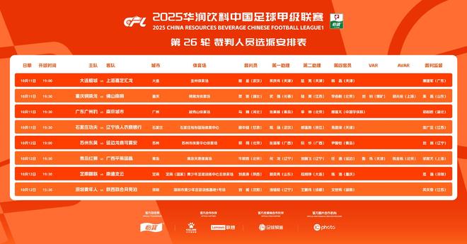 10月11日、12日,2025赛季中甲联赛展开第26轮争夺。赛前,中国足协发布了本轮裁判人员选派安排表。和前几轮一样,本轮涉及冲超、保级的2场关键对决,设置了视频裁判(VAR),分别是:重庆铜梁龙迎战佛山南狮,青岛红狮对阵广西平果国晶