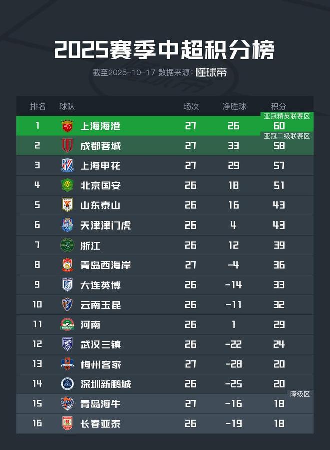 北京时间10月17日,中超联赛第27轮结束了第一比赛日的较量,联赛前三海港、成都和申花分别战胜了各自对手。